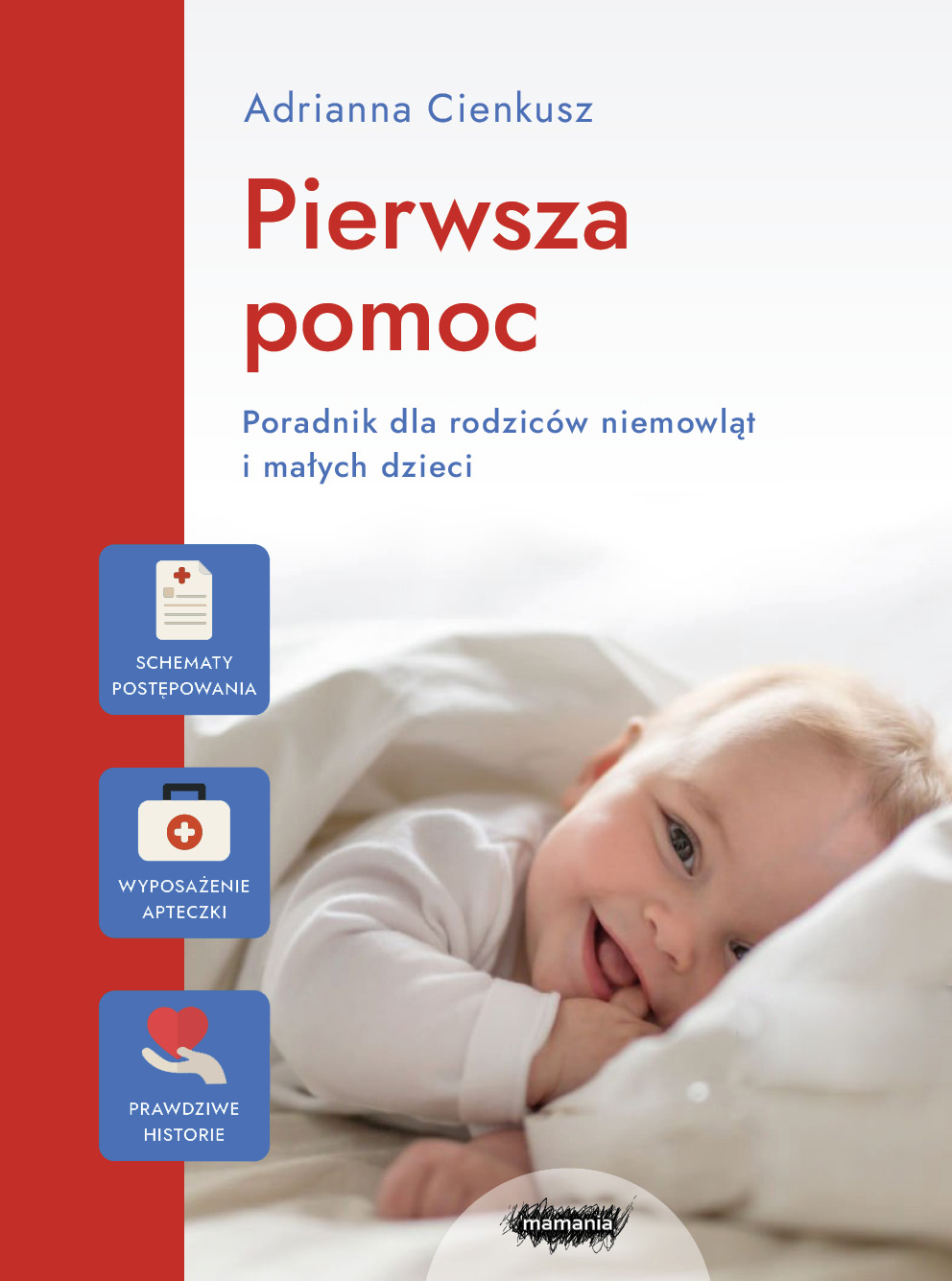 Pierwsza pomoc : poradnik dla rodziców niemowląt / Adrianna Cienkusz. - Warszawa : Mamania, copyright 2024. - 202, [21] stron : ilustracje ; 23 cm.